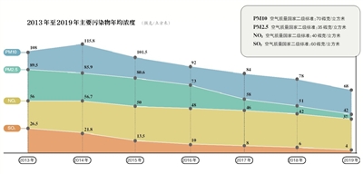 2019年,北京大气环境中PM2.5年均浓度为42微克/立方米,创2013年有监测记录以来新低。全年优良天数为240天,无严重污染日。二氧化氮(NO2)、可吸入颗粒物(PM10)首次达到国家二级标准。另外,北京正在开展PM1研究性监测。
