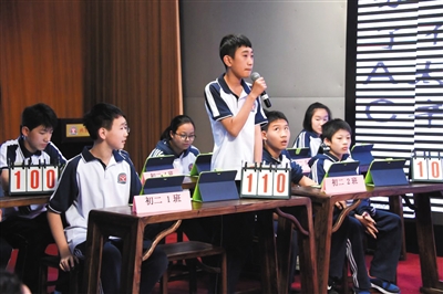 新京报讯 (记者冯倓秋)5月3日,北京市文汇中学集结初二年级历史知识达人,举行以“不忘初心,振兴中华”为主题的历史知识竞赛,以必答题、抢答题、观众参与题等形式考查学生的中国近代史知识。校长王文兰表示,这一活动是德育与教学的结合,希望通过这种学生喜闻乐见的形式,提升学生的史学水平;在“五四”青年节来临之际,对他们进行爱国主义教育。图为文汇中学初二1班学生代表回答问题。
