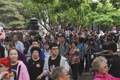 昨日,颐和园游客明显增加。当日,市属公园及园博馆共接待游客市民72万人,比昨日增加19万人。记者从市公园管理中心了解到,昨日,颐和园、动物园游客均突破10万人。其中,颐和园高峰时间启用九道弯、文昌阁、七曲桥、苏州街与佛香阁等5条单行线。新京报记者 侯少卿 摄