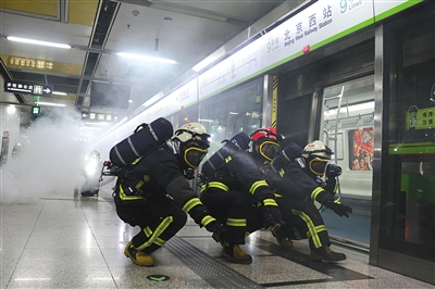 昨晚24时,北京西站地下灭火救援实战拉动演练中,消防员在浓烟现场使用前虚后实探步前进的方式,确保行进安全的同时搜索火点。当晚,北京消防在北京西站地下举行地铁灭火救援实战演练,演练调集市消防总队6个支队、23部消防车、200余名消防指战员及60余名微型消防站队员参演,设置发生火灾自防自救、接警调度赶赴现场、初战控火疏散救人、破拆内攻控烟散热、扑灭火灾全面排查五个阶段,主要围绕大客流人员应急疏散、微型消防站联动、固定消防设施应用等10个环节开展演练。新京报记者 刘名洋 实习生 陈婉婷 摄影报道
