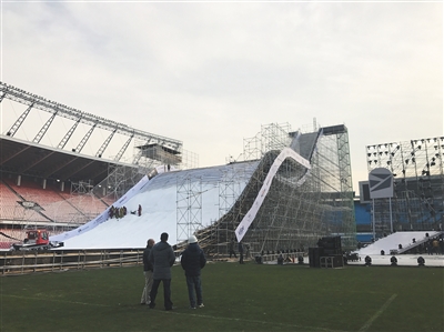 2017沸雪北京国际雪联单板滑雪大跳台世界杯,将于11月24日至25日在北京工人体育场举行。目前,舞台搭建以及造雪工作正在有条不紊地进行。赛事组委会表示,赛台的搭建速度和质量都没有问题,完全可以满足比赛的需求。