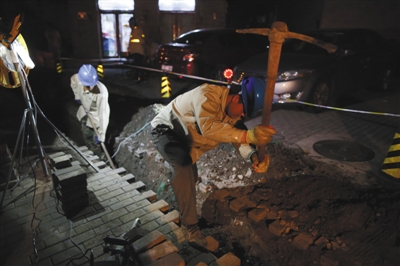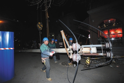 “向左,预备,起!再高点,小心树枝。”随着吊车指挥的一声声口令,矗立在青龙胡同的一根根钢筋水泥电线杆,完成了它们的历史使命,从地下被吊车拔了出来。11月17日晚9时,施工人员对北新桥地区青龙胡同的电力架空线启动撤线、拔杆工作。