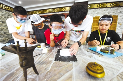 昨日,文物修复夏令营上,小营员在学习文物修复技法。当日,2019“大国工匠出少年”文物修复夏令营在故宫博物院闭营。来自全国各地的30多名中小学生完成了为期6天的文物修复技艺的探索之旅,感受了中华传统文化的博大精深。据介绍,“第二届文物知识公益竞赛”将于9月启动。此次竞赛成绩优秀者将有机会获得参加“大国工匠出少年”文物修复冬令营资格。 新京报记者 李木易 摄影报道