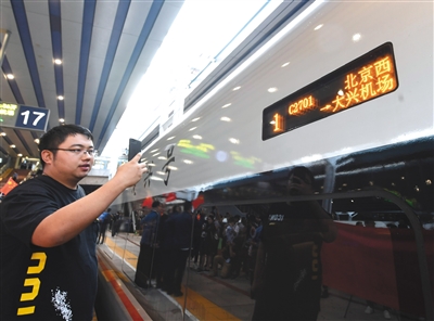 昨日,北京西站,乘客在拍摄北京西到大兴机场的C2701次列车。当日,京雄城际铁路(北京段)正式开通。北京客运段京广高铁车队列车长王珊介绍,共计551人搭乘首发列车从北京西站前往大兴机场,全程耗时仅30分钟。记者体验后发现,旅客通过任意一种交通方式抵达大兴国际机场后,步行五分钟左右均能到达距离自己最近的值机柜台。新京报记者 吴宁 摄