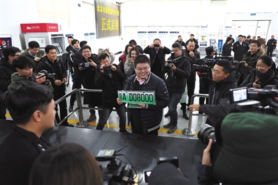昨日,北京市车管所京朝分所,来自顺义的高先生登记注册领到了新式的新能源车号牌。这是北京市发放的首张新式新能源车号牌。该专用号牌以绿色为主色调,与普通汽车号牌相比,新能源车号牌号码由5位升至6位,新号牌发放应用全国统一的选号系统,所有号牌号码统一监管、统一发放。对已登记的新能源汽车,按照“自愿换领”原则,由车主自主选择是否换领。北京市开辟了14 处“自愿换领”的地点。新京报记者 彭子洋 摄