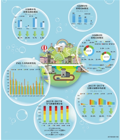 新京报讯 (记者邓琦)2017年,北京市PM2.5年平均浓度为58微克/立方米,完成国家“大气十条”下达的60微克/立方米左右的目标。另外,2017年北京市优良天数226天,比2016年增加28天;重污染日23天,比2016年减少16天。
