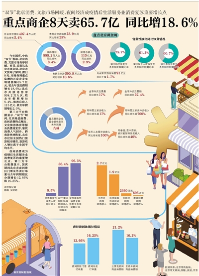今年国庆、中秋“双节”相逢,北京消费、文旅市场有序回暖。昨日,记者从北京市商务局、北京市文旅局了解到,假日8天,市商务局重点监测的百家企业实现销售额65.7亿元,较去年国庆假期增长18.6%;北京市共接待游客998.2万人次,较去年假期增长8.4%,旅游总收入115亿元,较去年假期增长2.9%。
