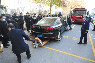 昨日,大兴区高米店街道香海园社区内,一辆黑色私家车占用消防通道,交通支队执法人员现场拨打车主电话,车主告知不在附近无法及时挪走后,交通支队组织物业工作人员进行车辆清拖,清拖费用将由车主负担。大兴区从即日起在全区范围内开展“打通生命通道”消防安全专项整治行动。新京报记者 王飞 摄影报道