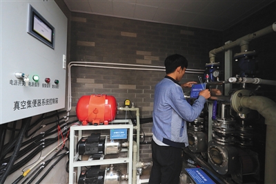 昨日,朝阳区牛王庙村,这里启用的真空排导技术改造的公厕正式投入使用,工作人员在操作间内安装提示牌。