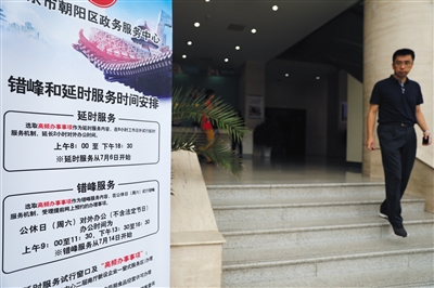 新京报讯 (记者沙雪良)日前,北京市业务办理量最大的政务服务中心——朝阳区政务服务中心在全市率先试行延时服务,对高频办事事项延长2小时服务时间,本周六起还将试行错峰办公。