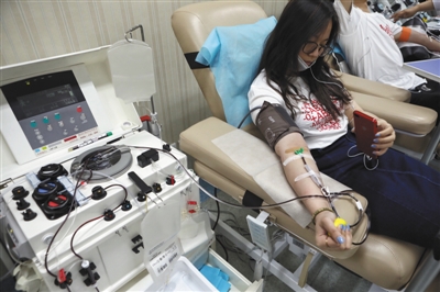 昨日,赵登禹路,北京市卫生计生监督所内,献血中的女士用手机拍摄自己的手臂。继今年北京献血政策改变后,血小板供应紧张曾一度引发外界关注。当日,北京血液中心在赵登禹路新设的献血小屋正式运营,今后捐献成分血的志愿者,除了北京血液中心外,又新增一个去处。为了扩大成分血来源,今年北京还将增加采成分血的移动采血车数量,街头采血点(全血)仍在扩充,本月底将达63个。新京报记者 王嘉宁 摄