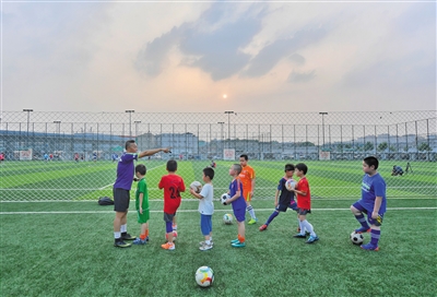 昨晚,十里河体育中心球场上,少儿队教练正给孩子讲解足球技巧。北京市应急响应下调至三级后,体育、文化场所有序开放。当日,位于朝阳区十八里店乡的十里河体育中心经过试运营正式对外开放。据介绍,体育中心所在地块从前是一片杂乱的建材批发市场,2018年,十里河村对该地块启动疏解整治工作。新京报记者 李木易 摄影报道