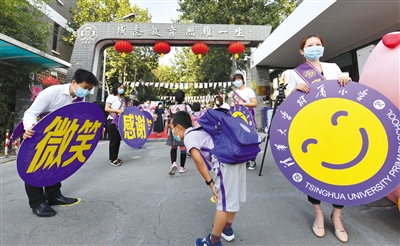 昨日,清华大学附属小学,家长志愿者手持欢迎标牌欢迎学生返校。当天,清华附小2200余名学生已全部开学。根据北京市错峰开学安排,9月7日,北京市小学二年级、三年级、四年级约52万名学生开学。至此,北京市中小学实现全学段线下开学。