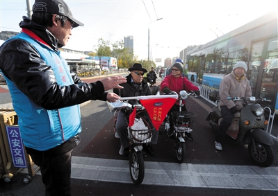 新闻报道摩托骑士路口“站岗” 劝导路人别抢行