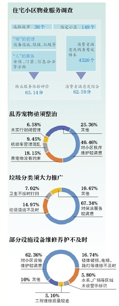 中国消费者协会公布的36个城市、148个住宅小区物业服务调查体验情况显示,物业服务实地体验评价得分65.14分,整体处于及格水平。从各个管理环节得分来看,设备设施管理得分84.70分,相对较高;环境管理得分64.89分,处于及格水平;秩序管理和客户服务管理相对较低,分别为59.35分和54.47分,处于不及格水平。新京报记者 戴轩