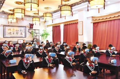 11月26日,朝阳区实验小学幸福校区的英语课上,教师通过5G网络分发教育资源到各个学生的VR终端。日前,北京首个5G+VR教学服务项目在该校幸福校区投入使用。“下潜”海底,与海洋生物亲密接触;“飞上”太空,探寻太阳系的奥秘;“化身”食物,感受人体消化的过程;“进入”火灾现场,体验如何从烈火中逃生……学生们戴上VR眼镜,就能在全景视频中“游历”,开展沉浸式学习。新京报记者 李木易 冯琪 摄影报道