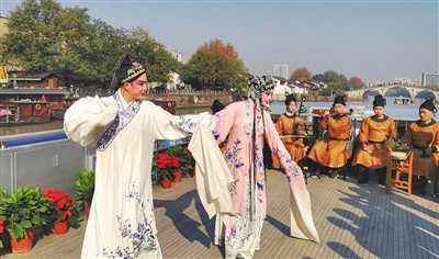 昨日,大运河杭州段,中国大运河文化带京杭对话系列活动之“大运河京杭雅集”在游船上举行。京杭两地戏曲、书画、古乐、茶艺等方面的非遗传承人和艺术家,进行了即兴创作和表演。图为昆曲艺术家表演《牡丹亭》选段。新京报记者 浦峰 倪伟 摄影报道