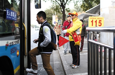 站在丰台区方庄八里河路口,52岁的宋泉路身穿柠檬黄的文明引导员队服,向遵守指示灯通行的行人一遍遍说着“给您点赞”。