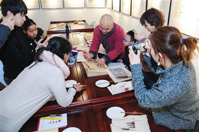 昨日,位于前门的华韵十竹斋艺术馆举办木版水印培训项目,由木版水印国家级非遗传承人、杭州十竹斋艺术馆馆长魏立中(中)授课,学员们将在几天时间内系统学习木版水印。