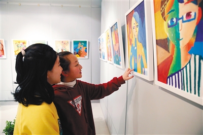 3月9日,在东城区第一文化馆,获奖学生(右)在向小伙伴介绍自己的作品。