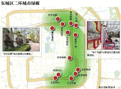 晨歌暮影、古河花雨、龙潭鱼跃……走在北京东城的街头,这13处景点让人置身于自然、简约的生态景观中,体验到“三季有花四季见绿”的观景。记者从北京市东城区园林绿化局了解到,东城区二环城市绿廊全长16.1公里,总规划面积39.4公顷。绿廊建有13个景观节点,呼应结合周边文化资源,让市民漫步在绿廊里可以随时观花赏景。