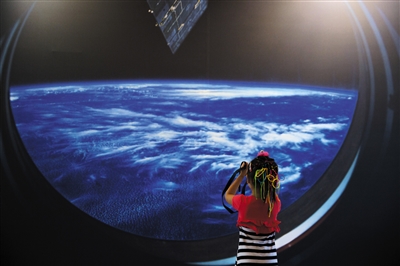 8月19日,民族文化宫展览馆,一位小朋友在用相机拍摄航天员杨利伟拍摄的作品《从神舟五号上看地球》。