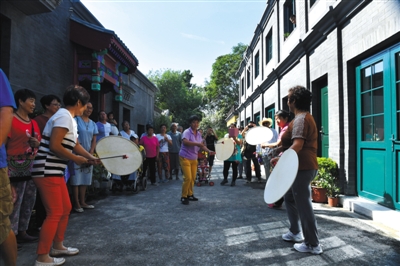 昨日,居民在改造后的模式口南小街上表演京西太平鼓。当日,石景山模式口文保区修缮改造工程的首个试点改造街区——南小街段媒体开放日活动举行。南小街位于田义墓及模式口大街南侧,全长170米,是模式口文保区修缮改造工程中的重要节点工程。模式口民俗老街作为西山文化发展带核心组成部分,承载着厚重的历史记忆,修缮改造将恢复历史原貌。其中包括将重现老舍《骆驼祥子》中原始风貌。新京报记者 浦峰 摄