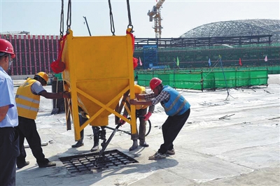 昨日10时18分,随着最后一罐混凝土浇筑完毕,北京新机场综合交通中心(停车楼及综合服务楼)工程主体结构实现全面封顶。综合交通中心工程是北京新机场航站区工程的重要组成部分,由地下轨道交通北段、停车楼、综合服务楼三大部分组成,位于主航站楼北侧,总建筑面积50.3万平方米。新机场航站楼整体将于2017年底实现封顶封围;2018年底实现新机场主体工程完工,2019年建成通航。杨志勇 摄