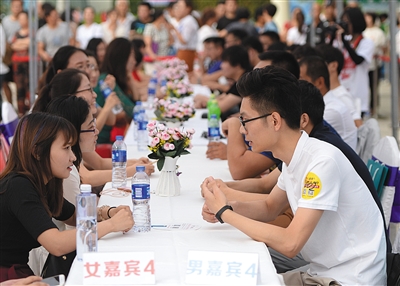 昨日,通州运河文化广场,参与相亲的青年男女有面对面3分钟交流时间,以互相了解。明天恰逢农历七月初七,是中国的传统节日“七夕节”。昨日下午,200名青年男女提前相约在通州运河文化广场,在“七夕”前走过“鹊桥”,寻找人生伴侣。这是北京七夕文化节的“鹊桥相亲会”,至今已连续举办五年。据了解,本届“鹊桥相亲会”报名人数超过千人,但最终能参加现场相亲活动的不足500人,竞争“激烈”。活动设立了多个环节,包括走红毯、面对面交流和游戏等环节。新京报记者 吴江 摄