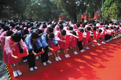 “拜入先师门,聆听圣人训,修身习礼仪,率性尊法纪,知行守道义,俯仰见天地,仁爱施于众……”昨天上午,一场效仿中国传统礼仪的拜师礼在孔庙大成殿前广场举行。来自五中教育集团的102位初一学生与东城区教育系统优秀教师代表互行鞠躬礼,学生们大声诵读拜师帖,为今后的求学之路明志。