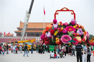 昨日,天安门广场,施工人员正在布置国庆花坛。记者从北京市花木公司了解到,国庆天安门花坛中心花篮昨晚开始吊装花盘,中心花篮主体今日完工,整体花坛景观预计明日布置完成。今年国庆,市民可在天安门广场中心再次见到“巨型花篮”,花篮将以花果篮为主景,篮内摆放着柿子、石榴、苹果等。北京市园林绿化局相关负责人介绍,花篮顶高17米,篮体高15.3米,底部采用心形图案。新京报记者 侯少卿 信娜 摄影报道