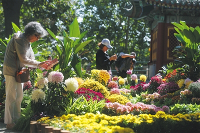 昨日,北海公园,市民们在花坛间赏菊拍照。当日,第九届北京菊花文化节开幕,今年是月季和菊花被确定为市花30周年,全市举办系列纪念活动,记者从北京市园林绿化局了解到,今年菊花文化节将设七大展区,包括北海、天坛、植物园、北京鲜花港、世界花卉大观园、世界葡萄博览园、北京市花木公司园艺中心,在近两个月时间里展示千余个品种、近百万盆菊花。新京报记者 侯少卿 信娜 摄影报道