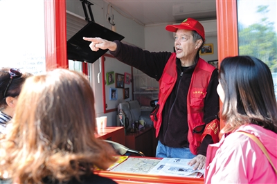 10月5日,国庆长假已经过半,后海景区依然游人如织。一对来自哈尔滨的游客,在靠近荷花市场正门的一处志愿服务岗亭前停下,向亭内戴着小红帽的志愿者问起路来。“北海北门?你从前面的马路,向右拐。”亭子内回道。两名游客似乎察觉了什么,盯着志愿者帽檐下的一双蓝眼睛端详,片刻,有些迟疑地问:“你是外国人吧?”