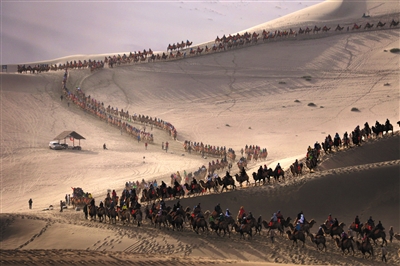 10月2日,众多游客在北京八达岭长城景区(图1)、河南洛阳龙门石窟景区(图2)、山西吉县黄河壶口瀑布景区(图3)、甘肃省敦煌市鸣沙山月牙泉景区(图4)游览。 当日是国庆长假第二天,各地景区迎来客流高峰。国家旅游局预计,10月1日至8日国内旅游人数将达到7.1亿人次,国内旅游收入将达到5900亿元,较去年同期分别增长10%和12.2%。图/新华社、新京报记者 王嘉宁