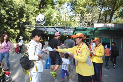 新京报讯 (记者信娜)在北京公交车站,身着黄色工作服的首都公共文明引导员成为熟悉身影。今年“十一”期间,这抹黄色也首次出现在北京动物园等市属公园。北京市公园管理中心相关负责人介绍,“十一”长假期间,将有100名首都文明引导员走进市属公园,协助开展文明游园引导。