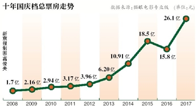2017年影市再次出现爆发点,国庆档8天假期以一骑当先的开心麻花新片《羞羞的铁拳》为首,新上映的几部国产新片各有斩获,全国票房就连续7日单日突破3亿,一共取得了26.1亿的票房佳绩。