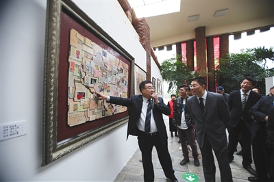 昨日上午,通州区宋庄镇大地艺术中心,工作人员向嘉宾介绍画作。当天,“盛世筑梦——践行核心价值观·喜迎党的十九大”主题艺术展活动举办。来自120位艺术家的150多件优秀作品参展,其中还有著名画家黄永玉创作的《采荷图》《晨趣》。此次展览将持续到10月15日,免费参观。