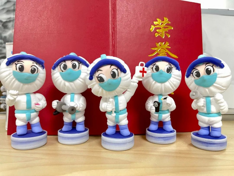 拿着棉签的“大白”、举着小喇叭的“大白”,手持测温仪的“大白”……这些以软陶制作的“大白”手办,栩栩如生,灵动可爱。他们来自建国门街道残疾人朋友们的精心制作。