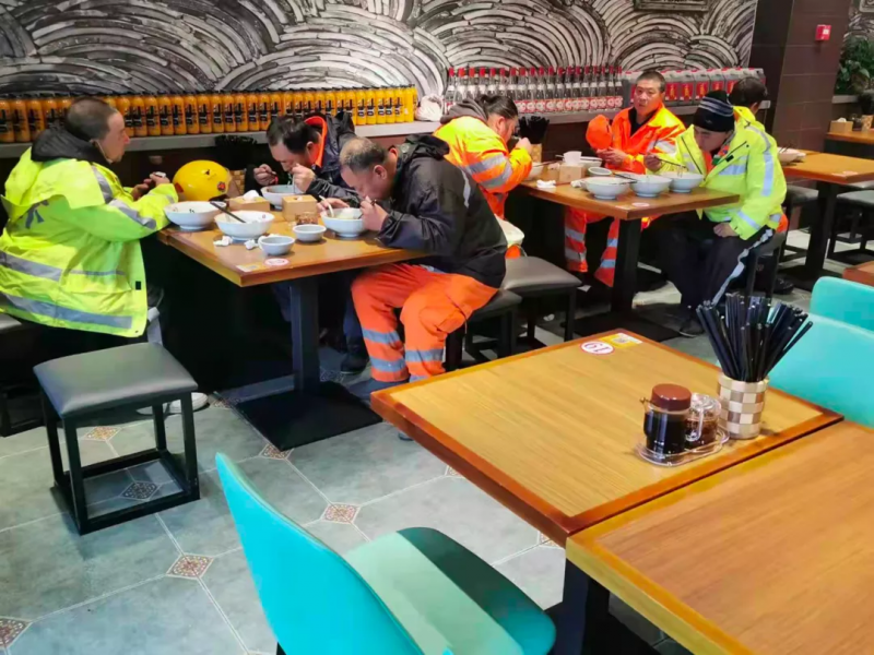 “师傅们慢点吃,不够再加。”11月7日中午,室外滴水成冰,室内暖洋洋的,位于丰台南路的大同刀削面馆里来了十几位特殊的客人,他们是7日凌晨开始顶风冒雪清理道路积雪的环卫工人们。