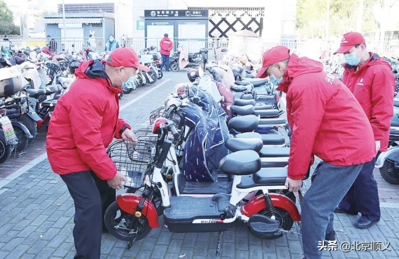 日前,在地铁15号线顺义站东南口,头戴小红帽、身穿红色志愿者服装的光明街道双拥社区的老兵志愿服务队队员,正在有条不紊地码放自行车,成为顺义光明广场上一抹靓丽的风景。