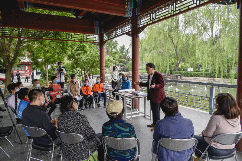 5月的玉河,天朗气清、流水潺潺、柳树成荫,一片生机盎然的景象。今天(5月13日)下午,河边的长廊上,一场别开生面的党史教育课正在进行。