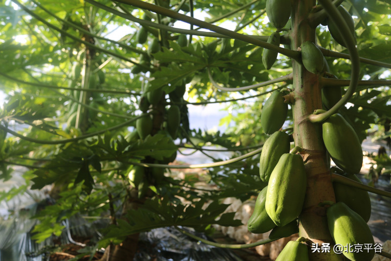 走进平谷区王辛庄镇放光村的广顺高效农业园区温室大棚,棚内新绿然然,暖意融融,郁郁葱葱,就像进入了热带丛林,一排排长势喜人的木瓜树,高大的树干上有的正开着白色的小花,有的结满了硕大的果实,层层叠叠,清香扑鼻。