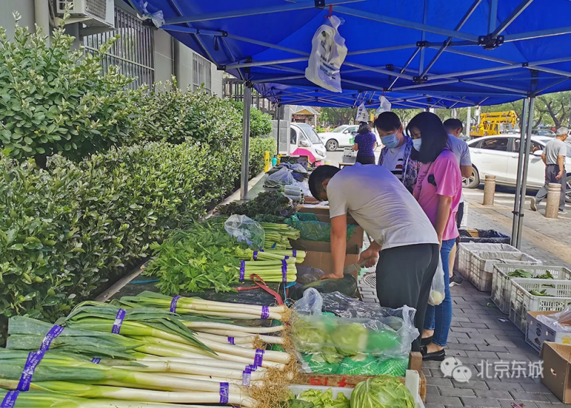 顶尖带刺的黄瓜、又大又红的西红柿、新鲜嫩绿的小油菜……一大早,“蔬菜直通车”带着30多种蔬菜、十多种水果来到交道口街道交东社区,在人流量较大的交道口6号楼前支摊售卖。