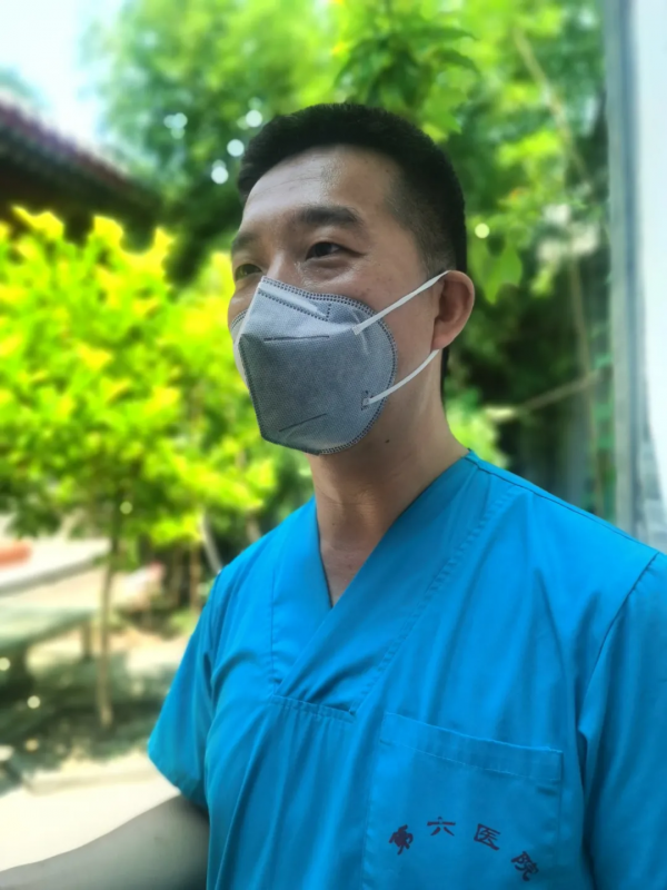 中午12点半,沙井胡同核酸检测点内一派忙碌的景象,有位穿着绿色刷手服的大夫脚步不停地在院里院外调整着工作节奏,他就是北京市第六医院胸血管外科病房副主任医师冯喆。