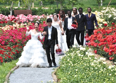 昨日,2016世界月季洲际大会期间,北京爱情海玫瑰文化博览园内,举办了“花好梦圆”公益集体婚礼。