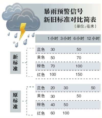 新京报讯 (记者邓琦)2015年8月北京启动暴雨预警信号标准修订,在完成面向市应急办、市防汛办等全市14家联动单位征求意见后,新版暴雨预警信号标准正式投入应用。新版标准仍为蓝、黄、橙和红四级预警,规范了发布时间和雨强。另外,新的预警信号表达更为直观、简洁,使得市民对雨情做到心中有数。