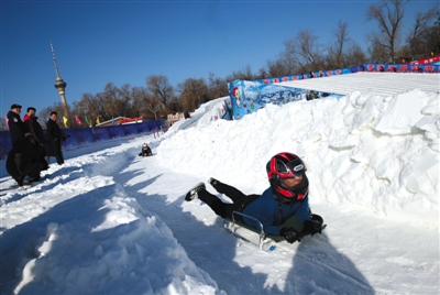 12月27日,玉渊潭公园冰雪乐园,一位游客戴着头盔体验俯式冰橇,其运动原理模拟了冬奥比赛中的雪车项目。当天,玉渊潭公园第八届冰雪季正式开幕,2万余平米的场地已经铺满白雪。公园负责人介绍,冰雪文化活动区域售票时间为每日9时至16时,周末延长至17时。此外,公园门票仍为每人2元,冰雪文化活动区域票价40元/人。