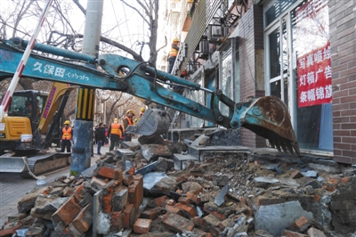 昨日,朝阳区青年沟路,工作人员正在清除居民楼里的临街商户。当日,朝阳区2017年“开墙打洞”治理工作启动,和平街道内的189个“开墙打洞”户是今年首批整治对象。近年来,为配合首都疏解治理创良好居住环境,朝阳区连续多年对居民楼违规底商进行整治,仅2016年,就整治了1800多户。该区计划2017年内再清理1800户。