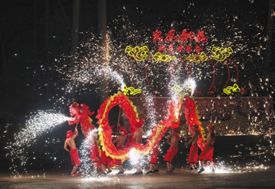 昨日,北京欢乐谷,重庆铜梁火龙钢花队在表演。火龙钢花是国家级非物质文化遗产,源自重庆铜梁,有“中华第一龙”的美誉。高达1500℃的铁水掺杂特制的干花被抛向天空,“铁水流星”瞬间洒向地面,赤膊上阵的舞龙者在“铁水流星”下舞动穿梭。新京报记者 薛珺 摄影报道