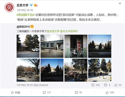北大“三角地”位于北京大学百周年纪念讲堂南侧,十年前,这里的信息栏被拆除,曾引发热议。2017年1月19日,“三角地”旁边的一片老房子被拆除,再一次引发北大校友的关注。